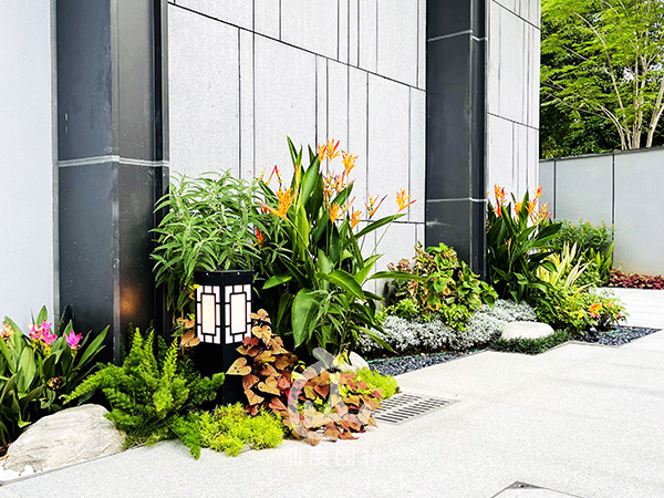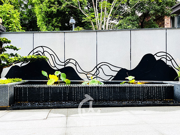 入口采用人车分流的形式,并着重强化人行入口,由建筑外观延伸出的门头造型,让庭院与建筑融合在一起。前院以迎客及停车功能为主,为了餐厅观景氛围,在餐厅窗户正对面的围墙设置金属山景墙与流水造景;与之遥相呼应的是建筑右侧的叠水水景墙,墙角的迎客松仿似时刻在欢迎主人归家。