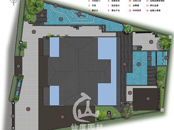 侧院打造漫步观景、独自静思的氛围,踱步而上静思台,卸下一天的疲惫,回归本心;沿水景池步行,水、石、绿植分界清晰,自然式的绿植搭配与直线条的布局形成鲜明对比。