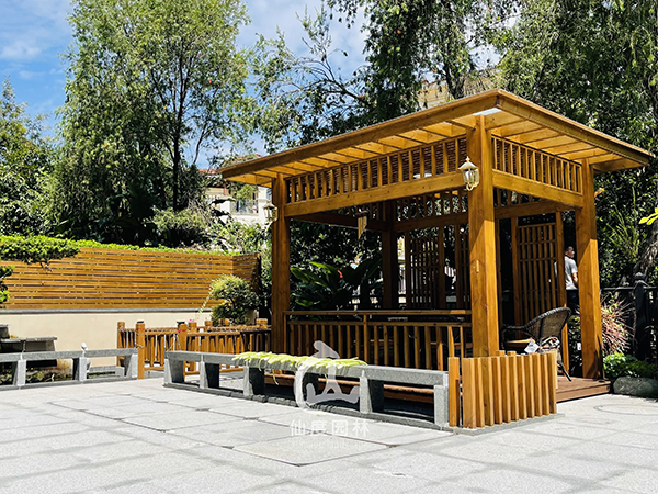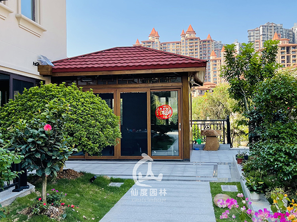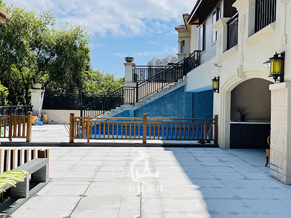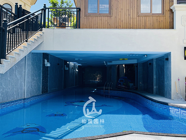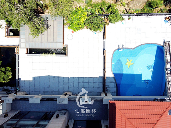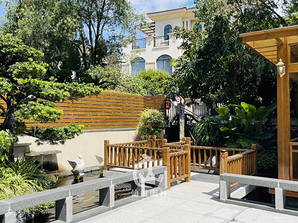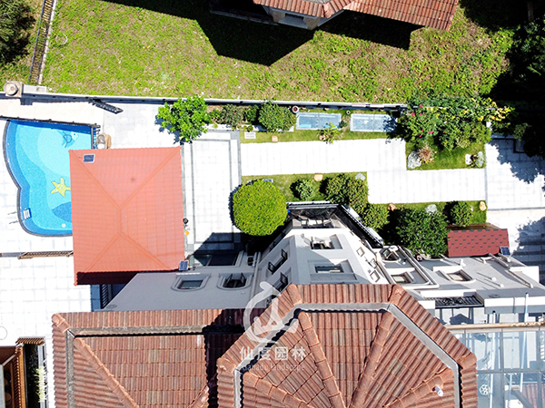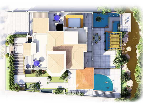 设计说明:整体布局以矩形构图为主,线条曲折硬朗,现代感十足。庭院分为上下两层,一楼以会客为主,设有舒适的茶室,绿化和景石点缀路边,干净整齐;负一楼自用为主,超大的泳池是家人戏水游乐的场所,鱼池和凉亭的结合的休闲区,可以畅聊静坐。