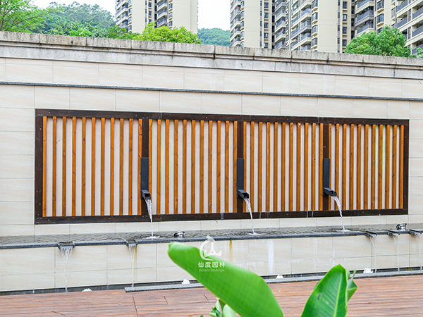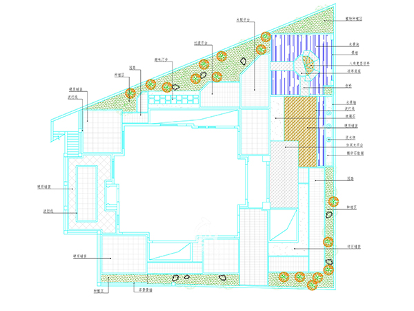 设计说明:整体设计以矩形线条为主,结合自然式的绿植,让整体规整而不觉单一。庭院流线贯通,两侧园路赏景;主要休闲庭院位于别墅后方,结合室内客厅功能在围墙上做了装饰小品与流水,增加立面的观赏性。