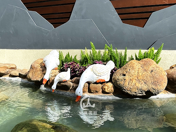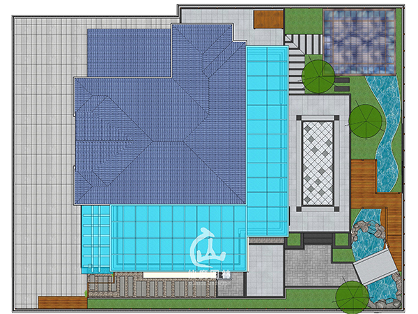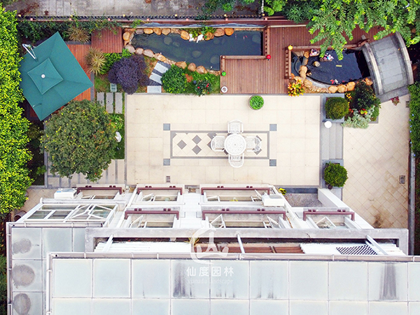 设计说明:现代矩形的平面构成,加以自然蜿蜒溪流,点缀东方装饰元素,实用基础上凸显独居的宁静。空间划分鲜明,观赏区、休闲区、晾晒区各居一角,加上立面空间的层次处理,使庭院饱满生动。