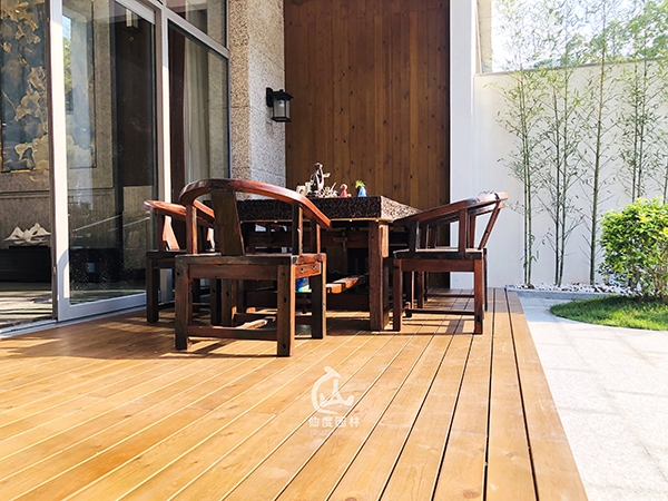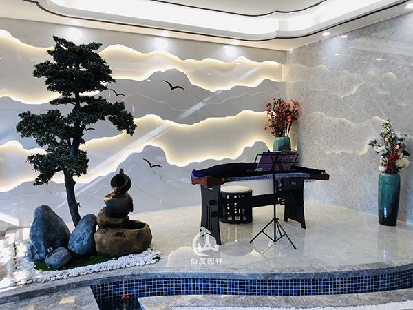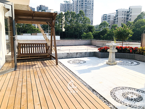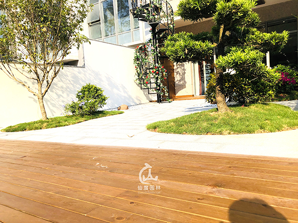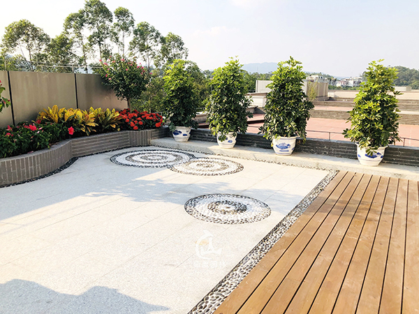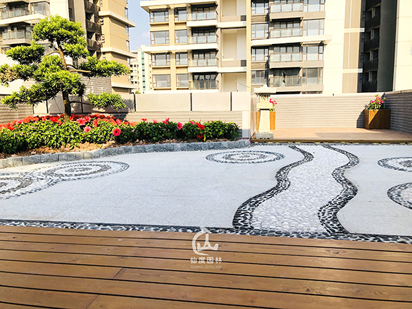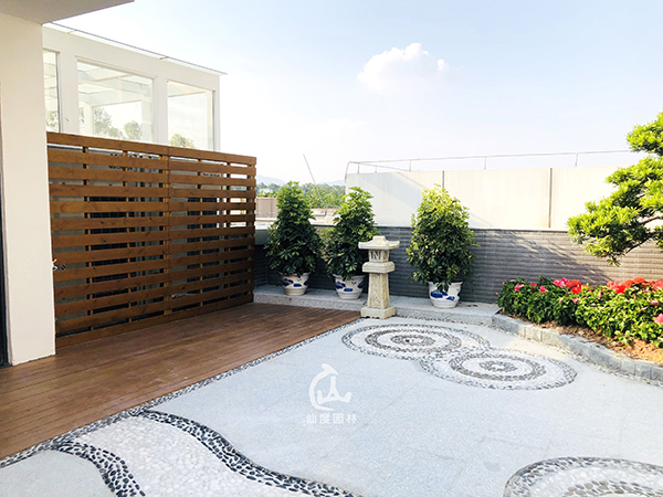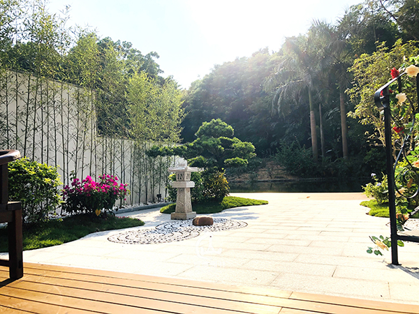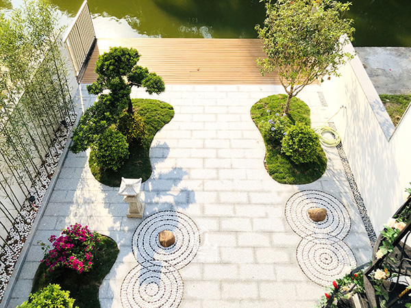 整体的设计灵感来自于日式枯山水造景,“以砂代水,以石喻山”。砂粒以黑白相间的雨花石铺贴代替,让整个庭院更加清爽简洁,便于打理。 后院天然水池边设计与水面交接的亲水木平台,彷佛让外部环境成为了庭院的一部分。或垂钓、或嬉水,让生活中频添乐趣。