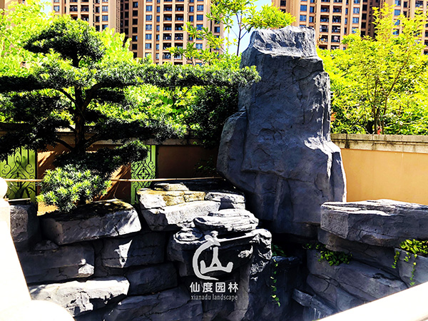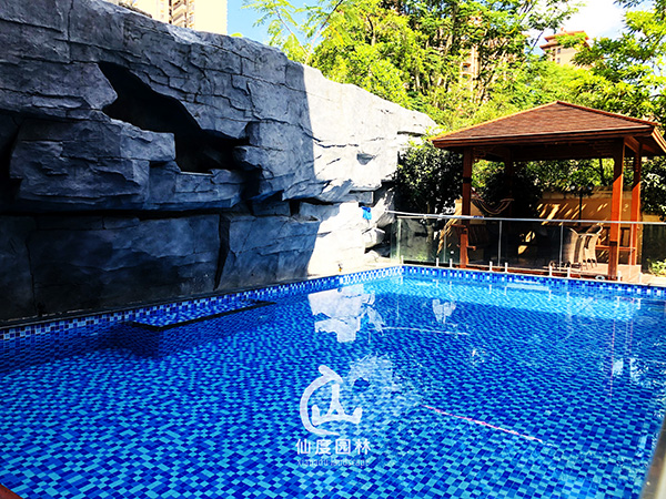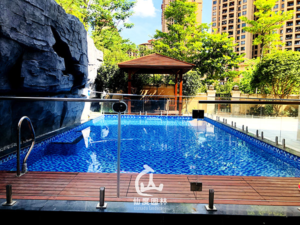简约式的布局,功能性为主,将后院分为泳池区、活动区、锦鲤池三块。硬质铺贴为主的家居型庭院,没有花哨的装饰,每个区域都有明确的用途。